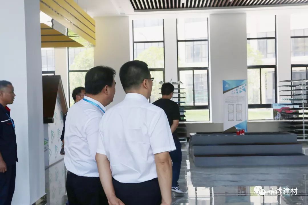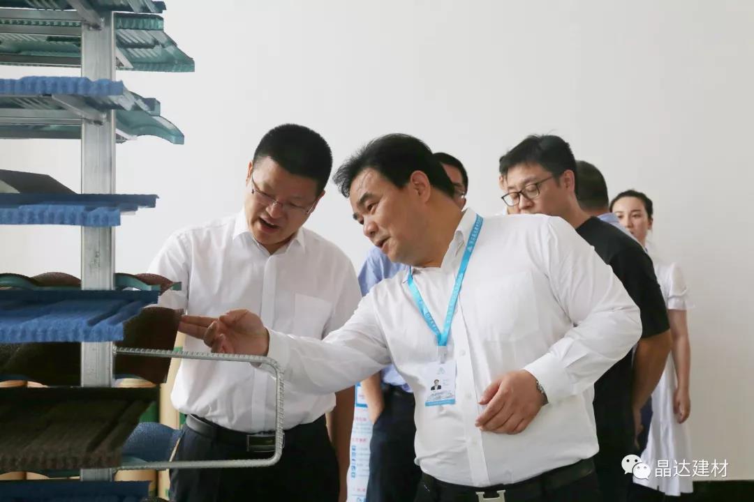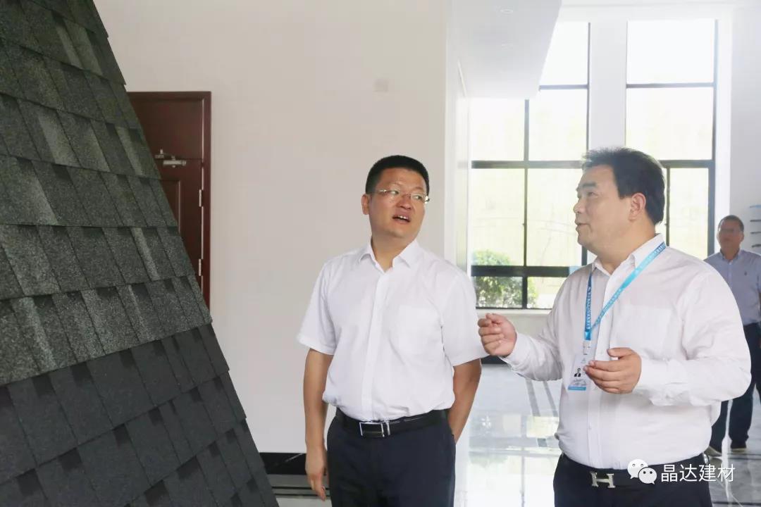 在晶達的產品展示廳內,高總經理首先向各位領導匯報了廠區建設與運行的工作情況,接著詳細介紹了我司的玻纖胎瀝青瓦、彩石金屬瓦、石油瀝青油氈、高分子防水卷材等系列主打產品。王市長對此表現出濃厚興趣,并親切慰問了工作人員。