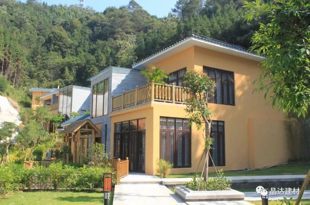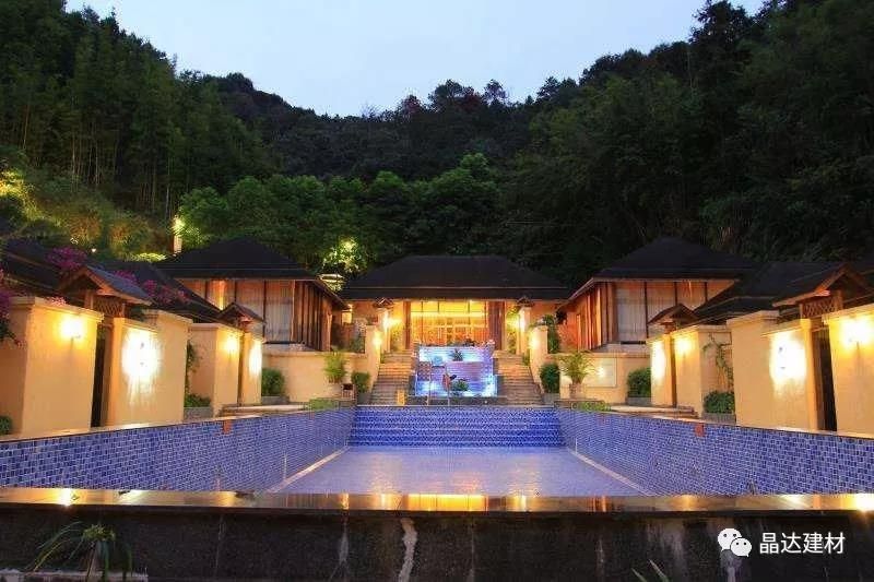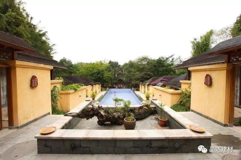 除亭臺與長廊外,“新西湖”瀝青瓦也因其優(yōu)良的品質(zhì),被大量運用于酒店別墅坡屋面中。以其大氣典雅的調(diào)性,與黃色系墻面搭配拼接,彌補了黃色本身過于羸弱的色彩印象,大大提升了建筑整體的神韻氣場。