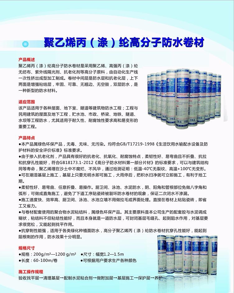 | 聚乙烯丙綸防水卷材 400克/平方 | 浙江諸暨 | 無 | 無紡布 | 無 | 適用于各種屋面 地下室及隧道等防水工程 |