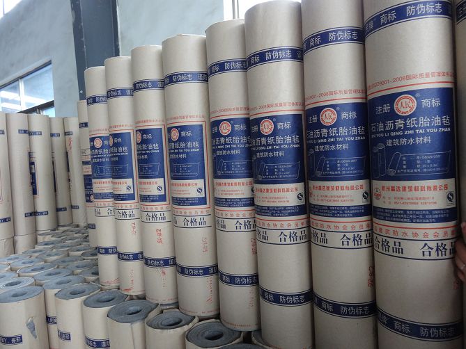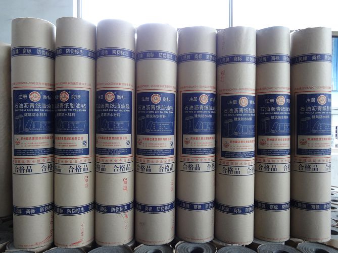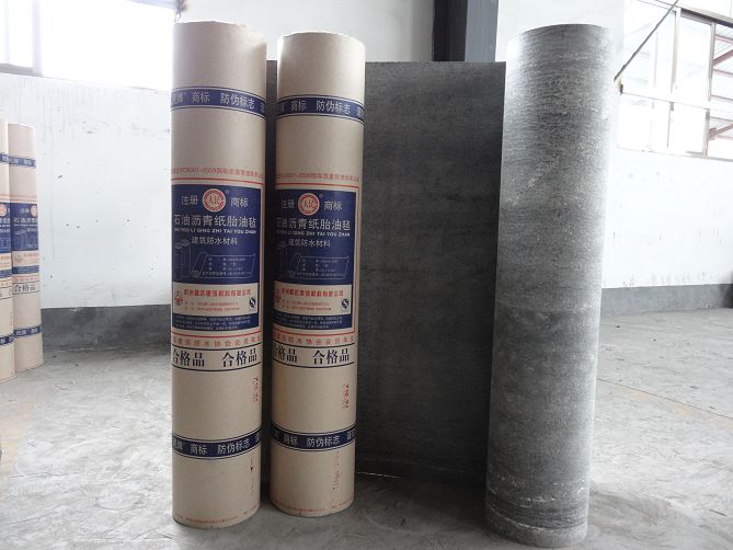 用動物的毛或植物纖維制成的氈或厚紙坯浸透瀝青后所成的建筑材料,有韌性,不透水。